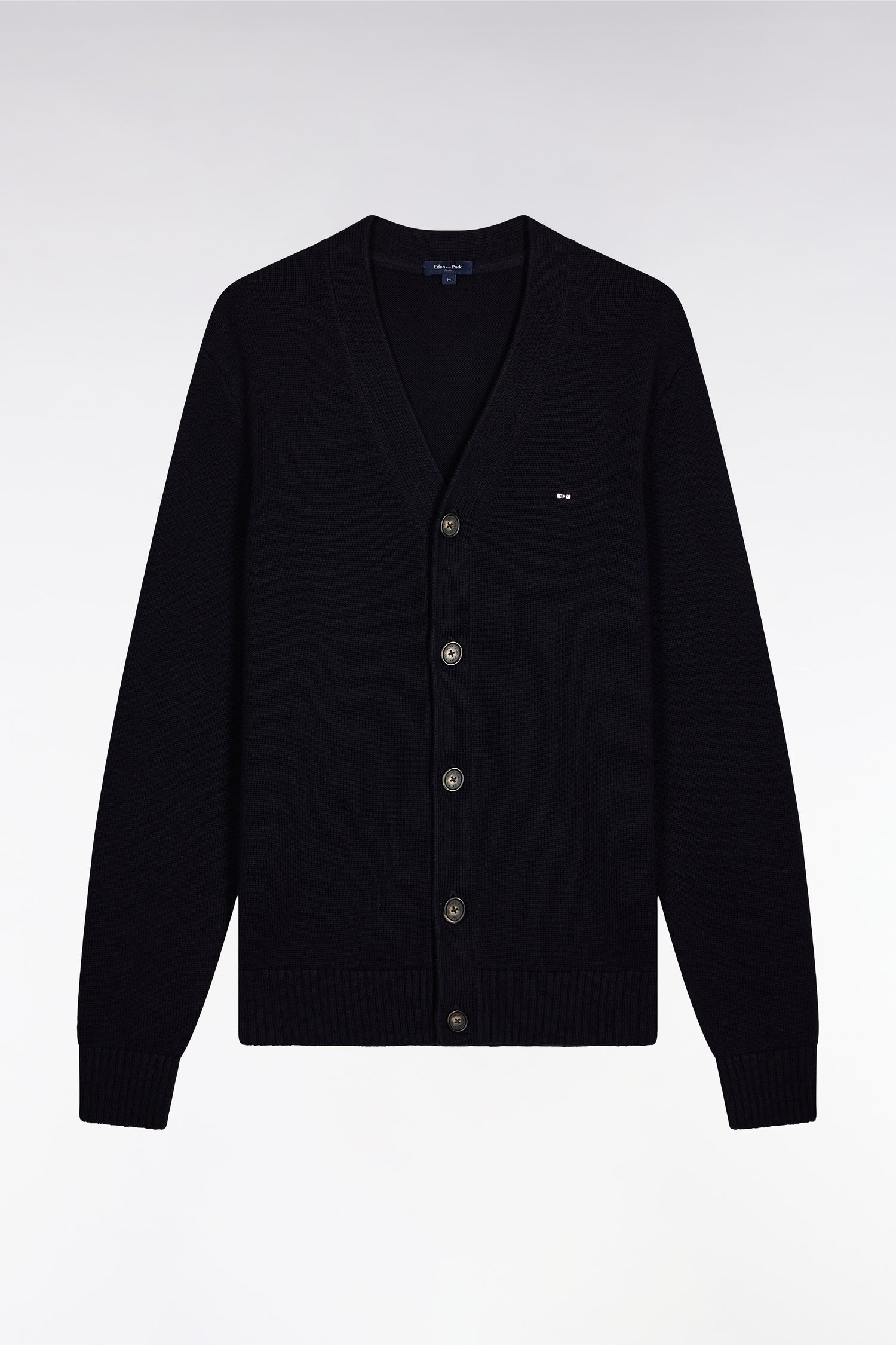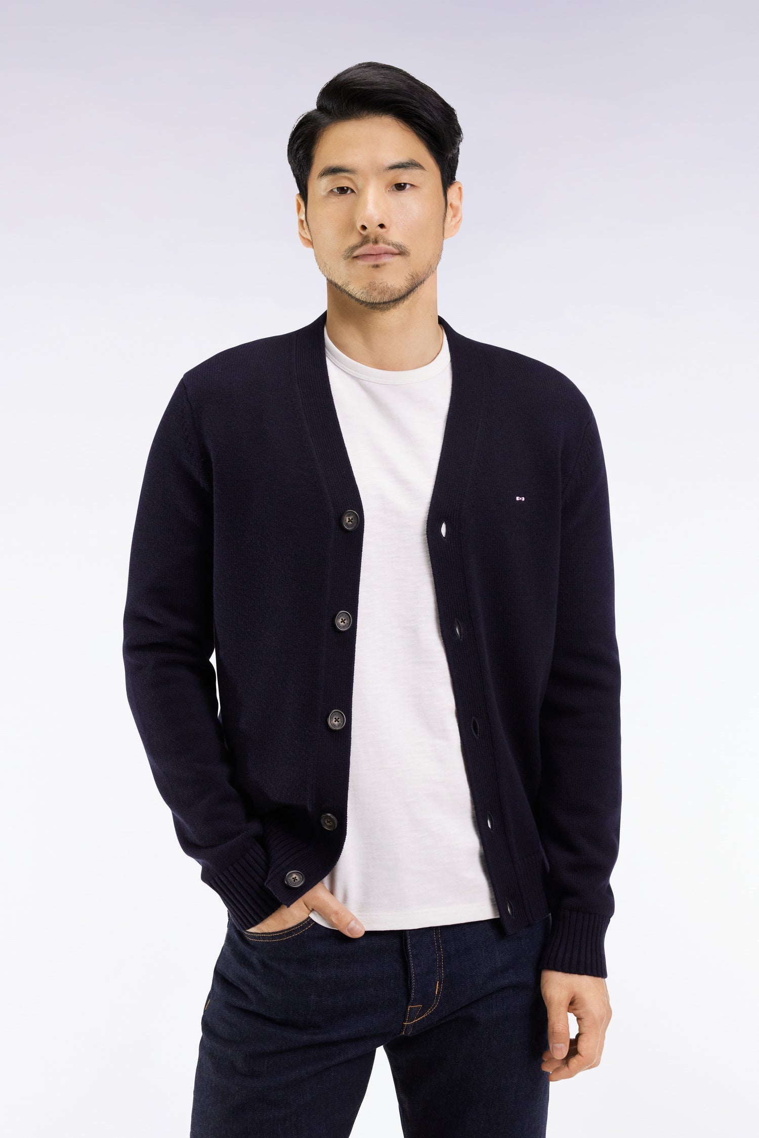 Our house style can be recognized by its subtle balance between rigorous cut, quality materials and freedom of detail. With its thick, flat-knit fabric in a soft wool-cotton blend, this V-neck cardigan embodies the perfect blend of craftsmanship and durability. Designed to last, its sturdy construction and meticulous finishing, from the button placket to the ribbed edges, make it a strong piece in the men's wardrobe, capable of weathering the seasons without losing its elegance. The pink bowtie embroidery discreetly marks this exceptional piece, true to the Eden Park heritage.