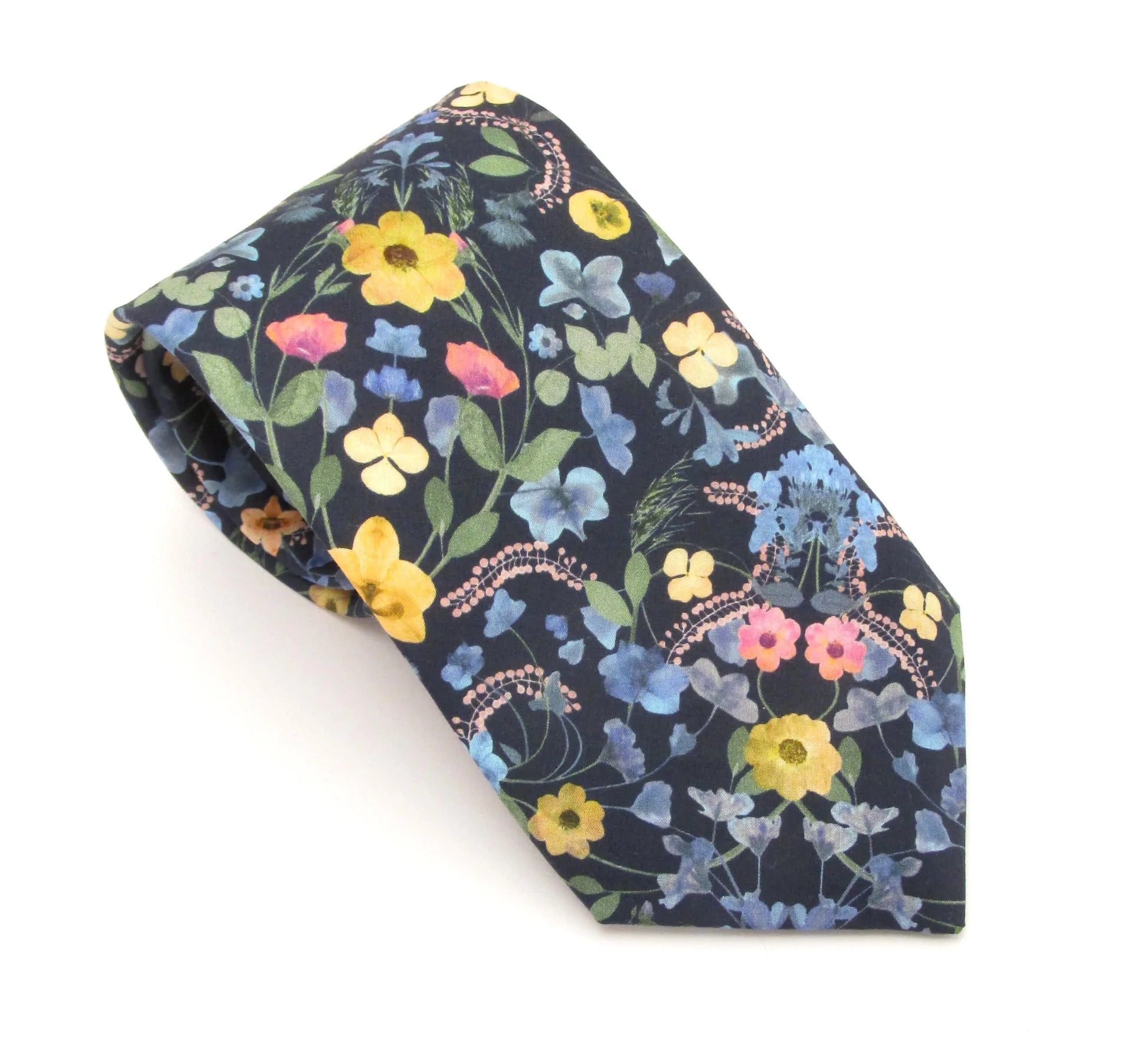 An Aurora Navy Cotton Tie Made with Liberty Fabric. An absolutely stunning Van Buck cotton range using exclusive Liberty Tana Lawn® printed fabric. This tie uses the Aurora print featuring a colourful floral garden coming to life in rich yellows, blues, peaches and greens over its deep navy background. We also have matching pocket squares as well as bow ties and self-tie bow ties available. This collection includes a range of different Liberty patterns which are all perfect for wedding ties, prom ties, events or even a day in the office. Order yours now and be sure to stand out with your dapper style!