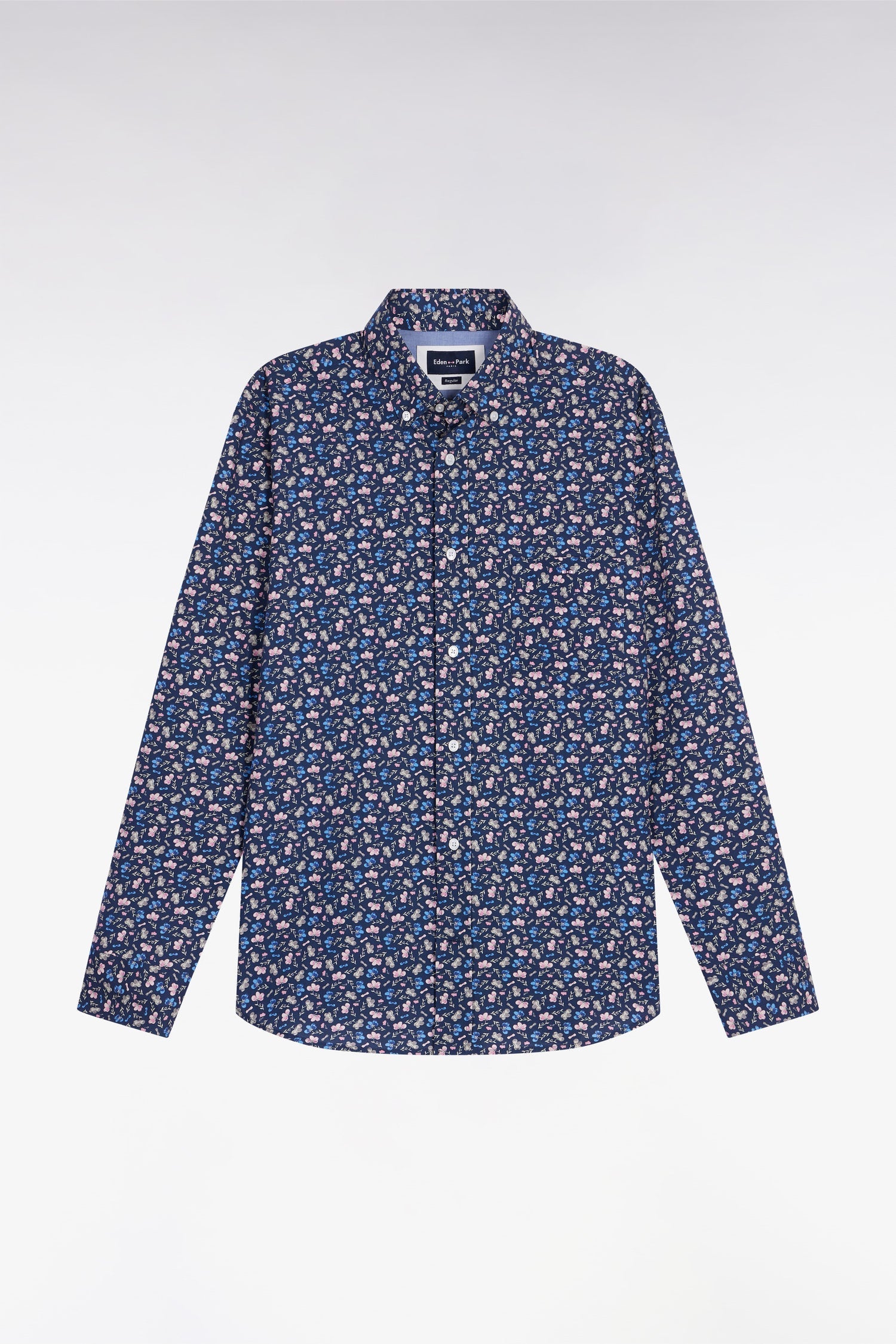 Each microprint in our fashion collections is a unique creation, designed exclusively for our company. On each one, fans of our French Flair wardrobe will recognize our emblem: the pink bow tie, hidden in its floral micro-patterns. Here, a blue-toned print is featured on a refined cotton poplin shirt.