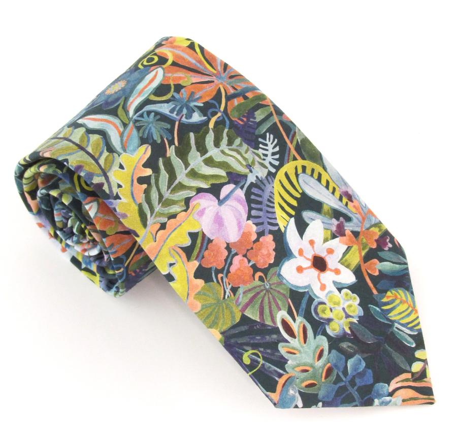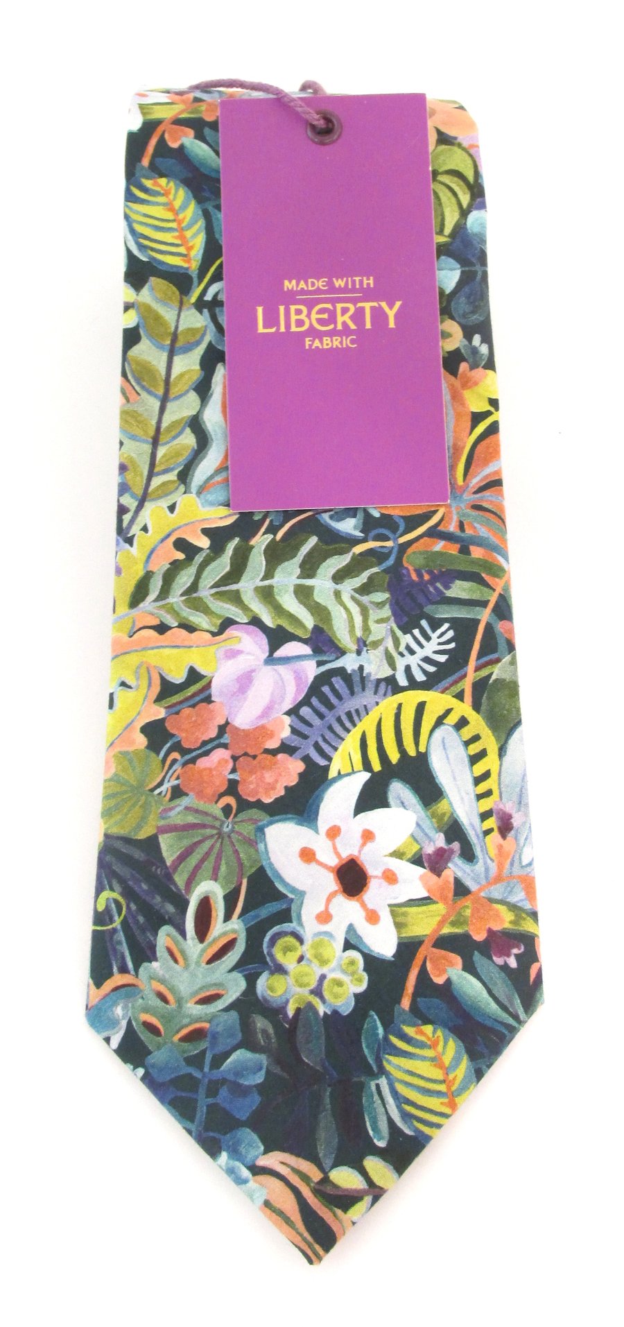An absolutely stunning Van Buck cotton range using exclusive Liberty Tana Lawn® printed fabric. This tie uses the Jungle print featuring bold greens, pinks and blues in a jungle foliage design on a navy background. We also have matching pocket squares as well as bow ties and self-tie bow ties available. This collection includes a range of different Liberty patterns which are all perfect for weddings, proms, events or even a day in the office. Order yours now and be sure to stand out with your dapper style!