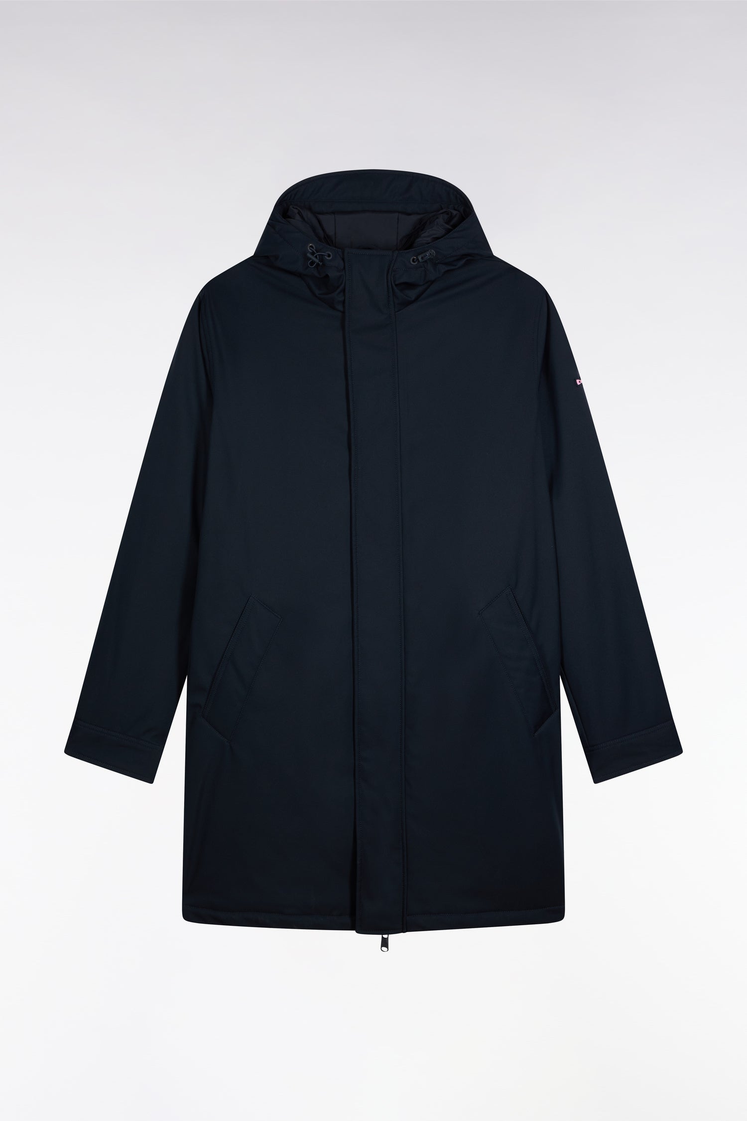 This long matte nylon parka embodies the perfect balance between urban sobriety and protection against the elements. Its interior quilting provides ideal thermal comfort for mid-season and winter alike. Its silhouette adjusts with a discreet drawstring at the back and hood. The double-zip concealed under the button placket, practical pockets and iconic finishing reinforce the functional, refined look of this men's parka with soft-touch supplies.